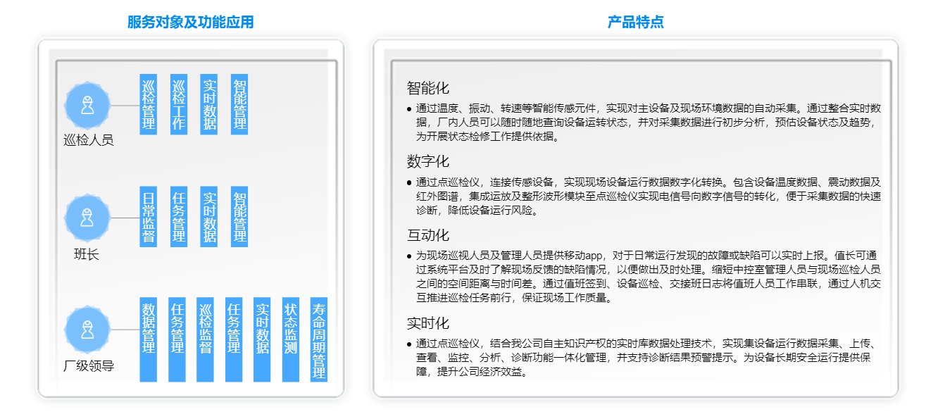 智能點巡檢系統(tǒng)以日常巡檢為主線,集臺賬維護、缺陷管理、設備狀態(tài)管理功能為一體、面向大型電氣設備實現(xiàn)標準化點巡檢任務并完成現(xiàn)場數(shù)據(jù)實時回傳及診斷分析的綜合應用平臺,適用于工業(yè)自動化領域。